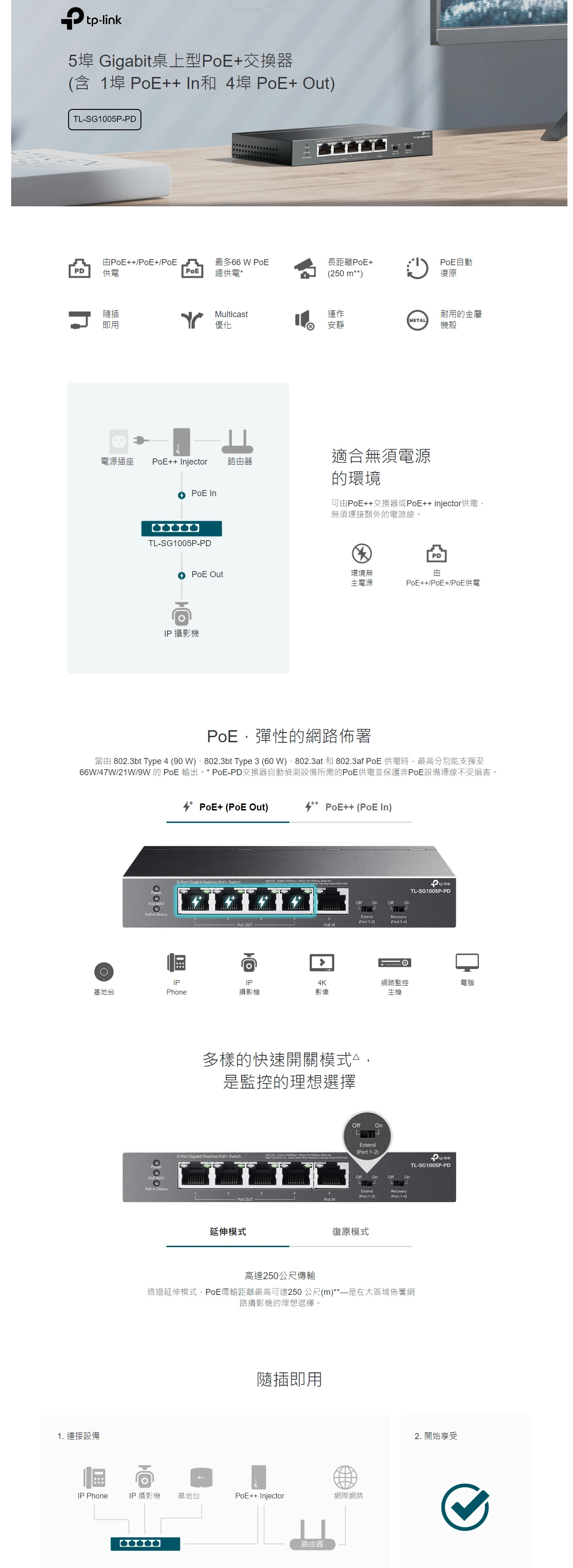 • 長距離 PoE+:借助擴展模式**,PoE 傳輸距離可達 250 m,適合大面積監視攝影機部署。