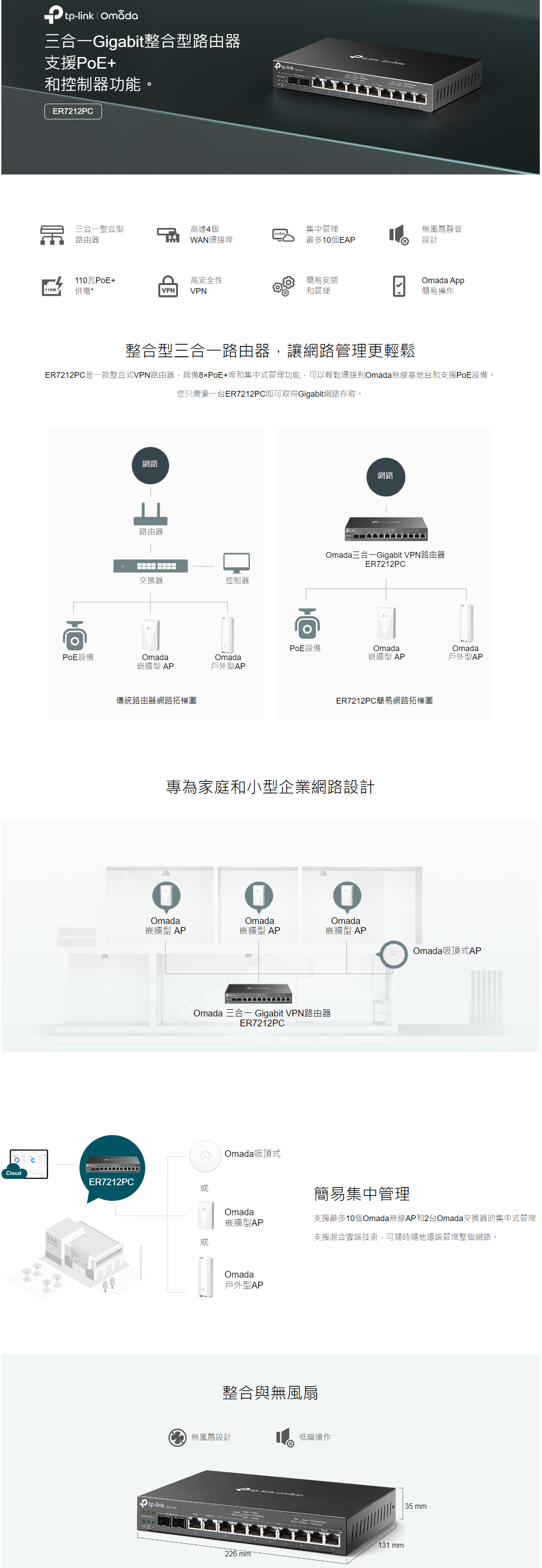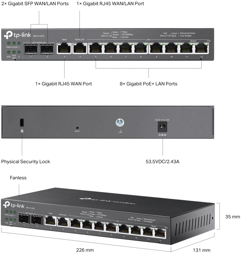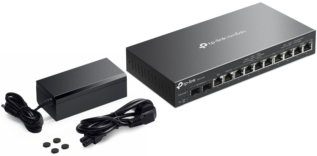 | Omada Gigabit VPN Router with PoE+ Ports and Controller Ability (Router + PoE Switch 110W + Controller) PORT: 2× Gigabit SFP WAN/LAN Port, 1× Gigabit RJ45 WAN Port, 1× Gigabit RJ45 WAN/LAN Ports, 8× Gigabit RJ45 LAN ports SPEC: 802.3at/af, 8 Ports with 110 W PoE Power, Desktop & Wall-mount Steel Case FEATURE: 3-in-1 (Router, PoE+ Switch, Controller), Support IPSec/PPTP/L2TP VPN & OpenVPN, Load Balance, Link Backup, Policy-based Firewall, Static Routing, Policy Routing, Multi-net DHCP, Guest Portal, VLAN, Cloud Access, Multi-site Management, Omada App |