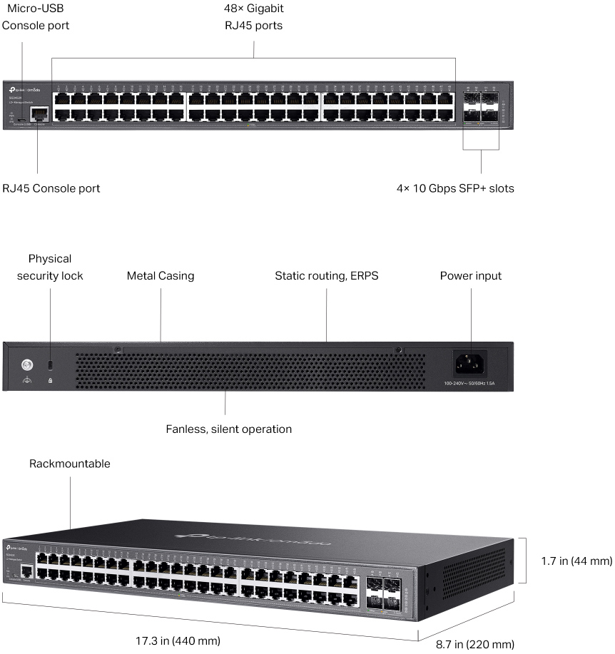 | Omada 48-Port Gigabit L2+ Managed Switch with 4 10GE SFP+ Slots, 19-inch Rack-mountable Steel Case | |