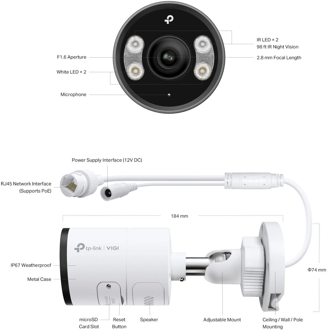 | 4MP Full-Color Bullet Network Camera SPEC: Fixed Lens, 1/2.7” Progressive Scan CMOS, H.265+/H.265/H.264+/H.264, IR/White LED, 25fps/30fps (2688x1520), IP67,Web, PoE/DC 12V,120dB WDR, Built-in MIC/Speake, micro-SD Slot FEATURE: Full-Color and IR Night Vision (Up to 30 m), Smart Detection (Human &Vehicle Classification)(MotionDetection, Area lntrusion Detection, Line-Crossing Detection, Camera Tampering Detection, Abandoned ObiectDetection, Obiect Removal Detection, Area Entrance Detection, Area Exiting Detection, Human Detection), SmartVid (Smart IR, 3D DNR, BLC), ONMF, Remote Monitoring, VIGI App, Web, VIGI Security Manager |