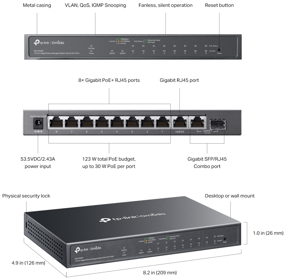 | Omada 10-Port Gigabit Easy Managed Switch with 8-Port PoE+(123W), 8× Gigabit PoE+ Ports, 1x Gigabit Non-PoE Ports, 1× Combo Gigabit RJ45/SFP Port, Desktop Steel Case and Fanless | |