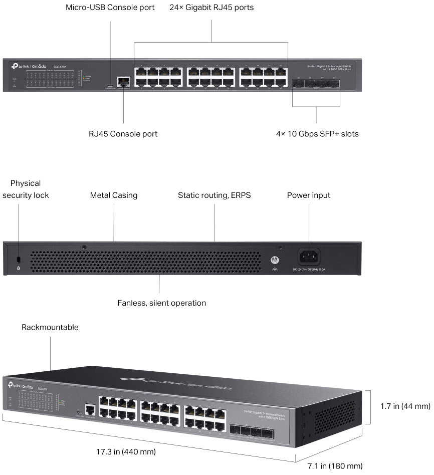 | Omada 24-Port Gigabit L2+ Managed Switch with 4 10GE SFP+ Slot, 19-inch Rack-mountable Steel Case | |