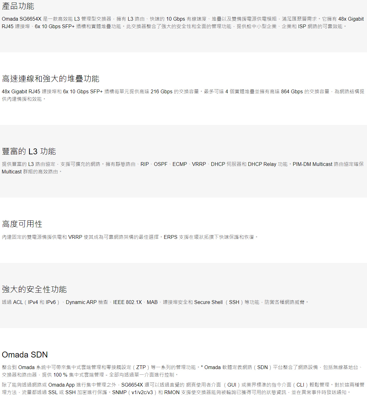 | Omada 48-Port Gigabit Stackable L3 Managed Switch with 6 10GE SFP+ Slots PORT: 48× Gigabit RJ45 Ports, 6× 10G SFP+ Slots, RJ45/Type C USB Console Port, Management Port, 2× USB2.0 Ports SPEC: 1U 19-inch Rack-mountable Steel Case FEATURE: Integration with Omada SDN Controller, Stacking, RIP, OSPF, VRRP, ECMP, PIM-DM, Static Routing, DHCP Server, DHCP Relay, ERPS, RSPAN, QinQ, OAM, sFlow, DDM, 802.1Q VLAN, STP/RSTP/MSTP, IGMP Snooping, 802.1p/DSCP, QoS, ACL, 802.1x, Radius/Tacacs+ Authentication, LACP, CLI, SNMP, Dual Image/Configuration, IPv6, Dual Redundant Power Supplies |