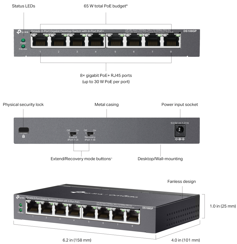 | Omada 8-Port Gigabit Desktop Switch with 8-Port PoE+ (64W), Desktop Steel Case | |