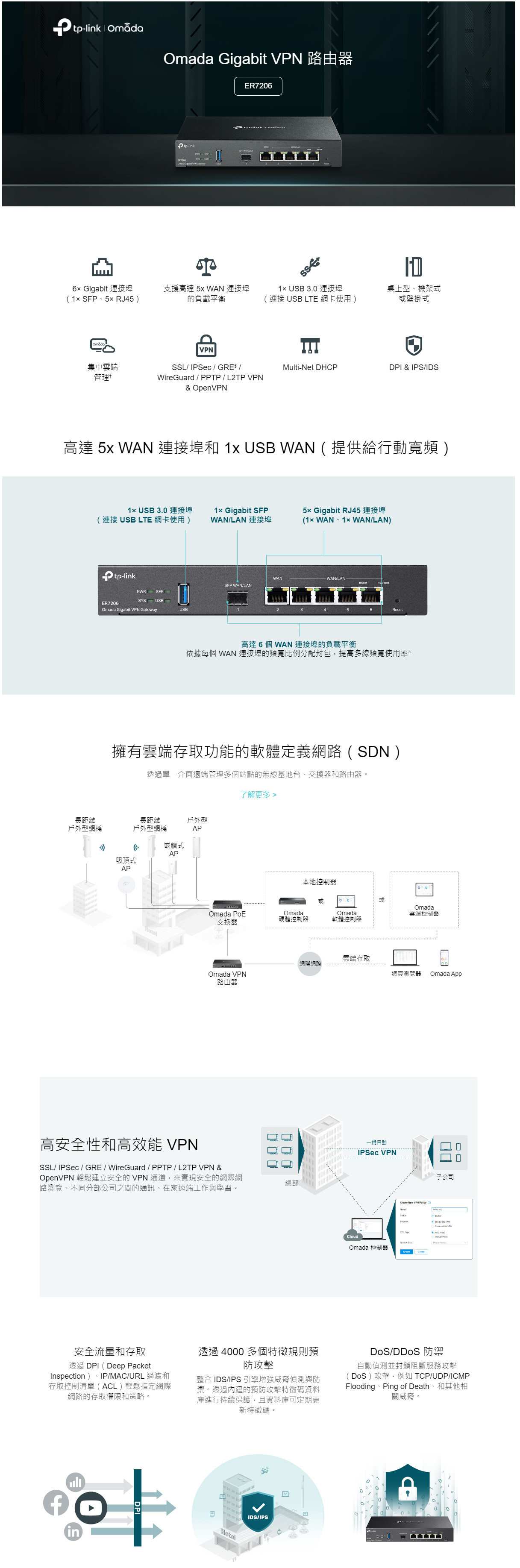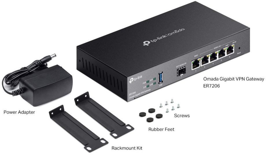 | Omada Gigabit VPN Router PORT: 1× Gigabit SFP WAN Port, 1× Gigabit RJ45 WAN Port, 2× Gigabit WAN/LAN RJ45 Ports, 2× Gigabit RJ45 LAN port FEATURE: Integration with Omada SDN Controller, Support 100 IPsec VPN Tunnels, 50 PPTP/L2TP VPN Tunnels, 50 OpenVPN Tunnels, 150000 Concurrent Sessions, Load Balance, Link Backup, Policy-based Firewall, Static Routing, Policy Routing, Multi-net DHCP, Guest Portal, VLAN |
