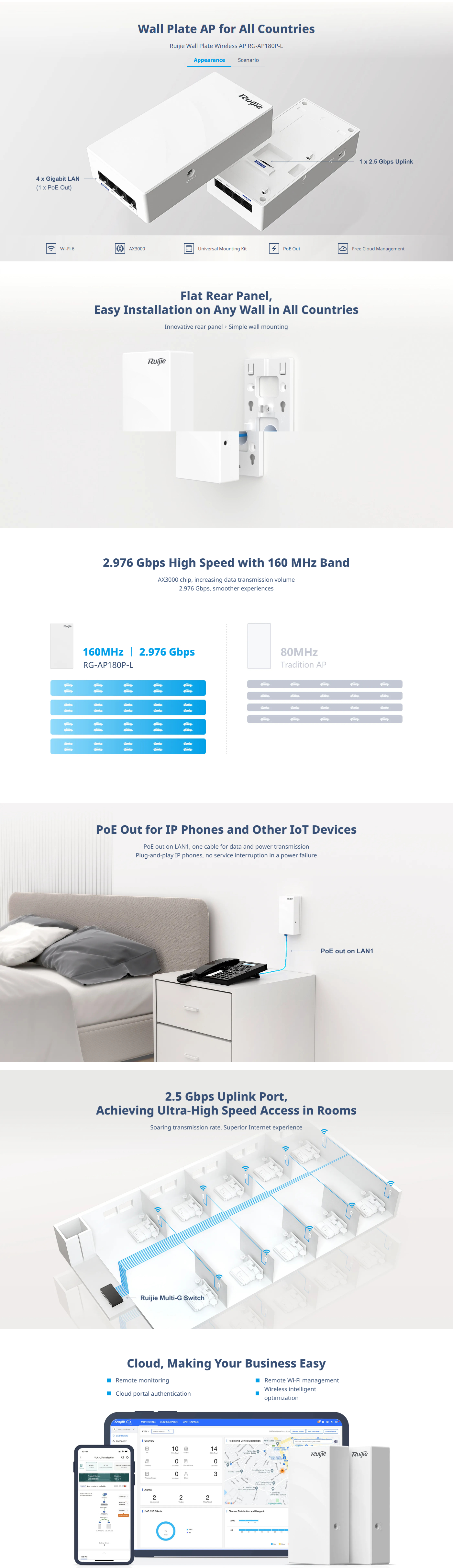 | Description | Wall Plate Wi-Fi 6 (802.11ax) Access Point, built-in antenna, dual-radio dual-band, support [email protected] and 2400Mbps@5G, up to 4 spatial streams and 2976Mbps access rate per AP, support concurrent 802.11a/b/g/n/ac and 802.11ax;1 100/1000/2500M Base-T uplink supporting PoE/PoE+ and local power supply. 4 10/100/1000M Base-T downlink, LAN1 support PSE out. FAT/FIT mode, bundled with Ruijie Cloud Service lifetime license , Universal Mount Included. (PoE/PoE+ Adapters are sold separately, which could be purchased from Ruijie; While DC adapters should be purchased from third-party vendors separately if needed) |
