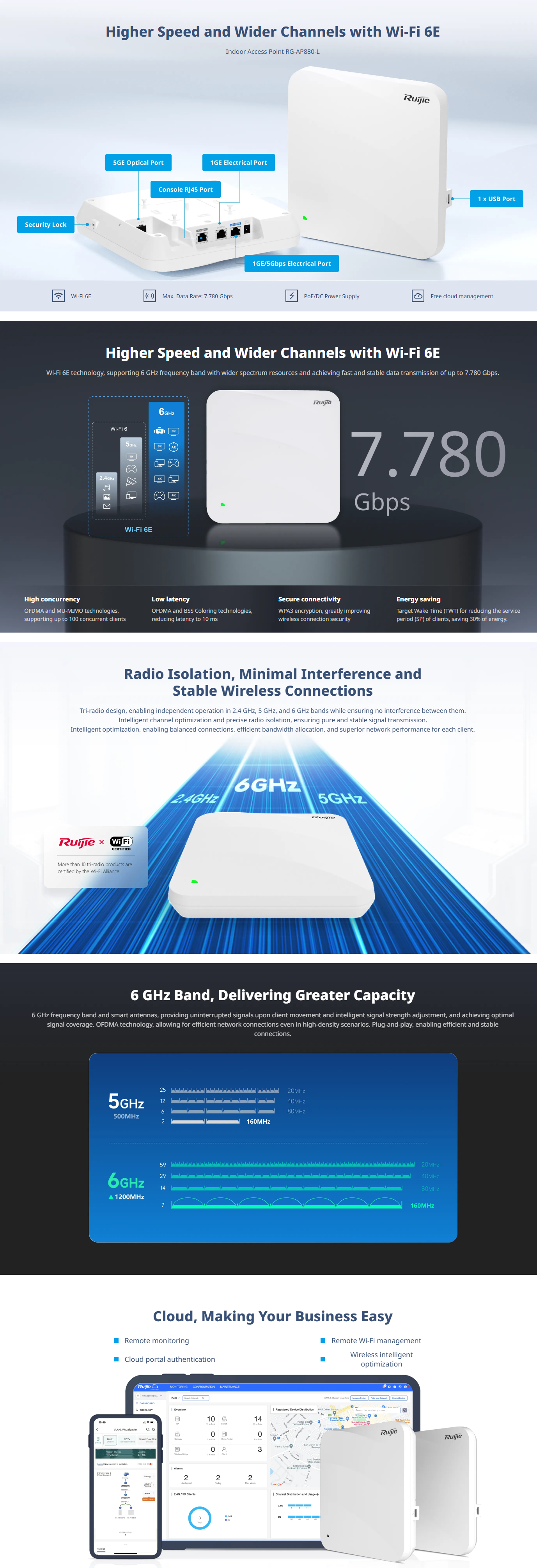 Description Wi-Fi 6e indoor wireless access point, dual-radio, dual-band, up to 8 spatial streams and maximum of 7.77Gbps wireless throughput, 1 1/2.5/5G Combo uplink port, support PoE/PoE+/PoE++ and local power supply; 1 10/100/1000M Base-T downlink port supporting PSE out; Bundled with Ruijie Cloud Service lifetime license (PoE/PoE+/PoE++ Adapters are sold separately, which could be purchased from Ruijie; While DC adapters should be purchased from third-party vendors separately if needed)