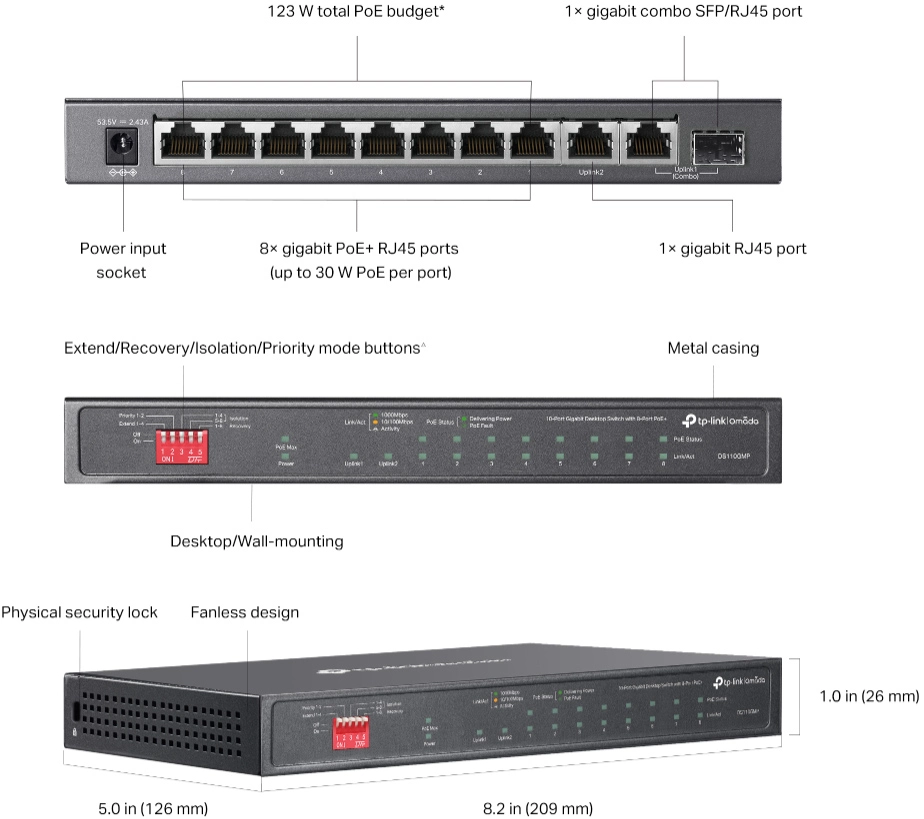 | Omada 10-Port Gigabit Desktop Switch with 8-Port PoE+ (123W) 8× Gigabit PoE+ Ports, 2x Gigabit Non-PoE Ports, 1× Combo Gigabit SFP Slot,Desktop Steel Case | |