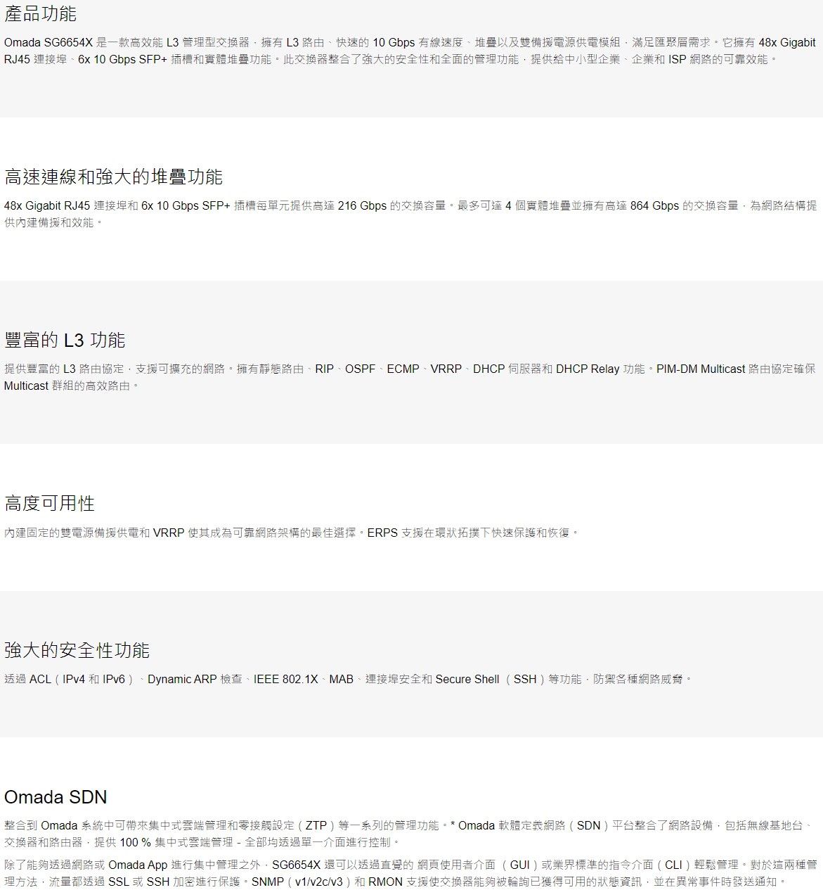 FEATURE: Integration with Omada SDN Controller, Stacking, RIP, OSPF, VRRP, ECMP, PIM-DM, Static Routing, DHCP Server, DHCP Relay, ERPS, RSPAN, QinQ, OAM, sFlow, DDM, 802.1Q VLAN, STP/RSTP/MSTP, IGMP Snooping, 802.1p/DSCP, QoS, ACL, 802.1x, Radius/Tacacs+ Authentication, LACP, CLI, SNMP, Dual Image/Configuration, IPv6, Dual Redundant Power Supplies