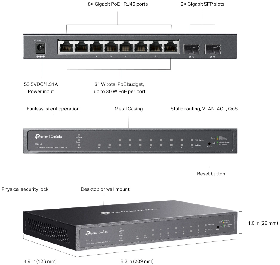 | Omada 8-Port Gigabit Smart PoE+ (58W) Switch with 2 SFP Slots ,Desktop Steel Case | |