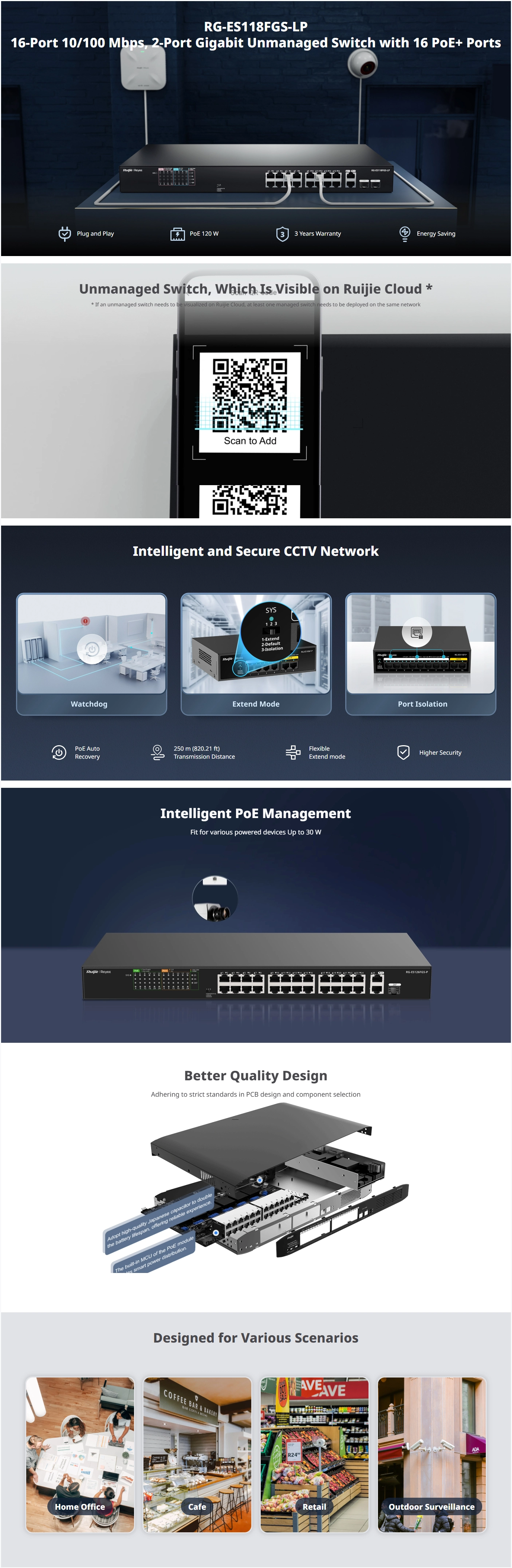 Ruijie Reyee PoE Unmanaged Switch, RG-ES118FGS-LP