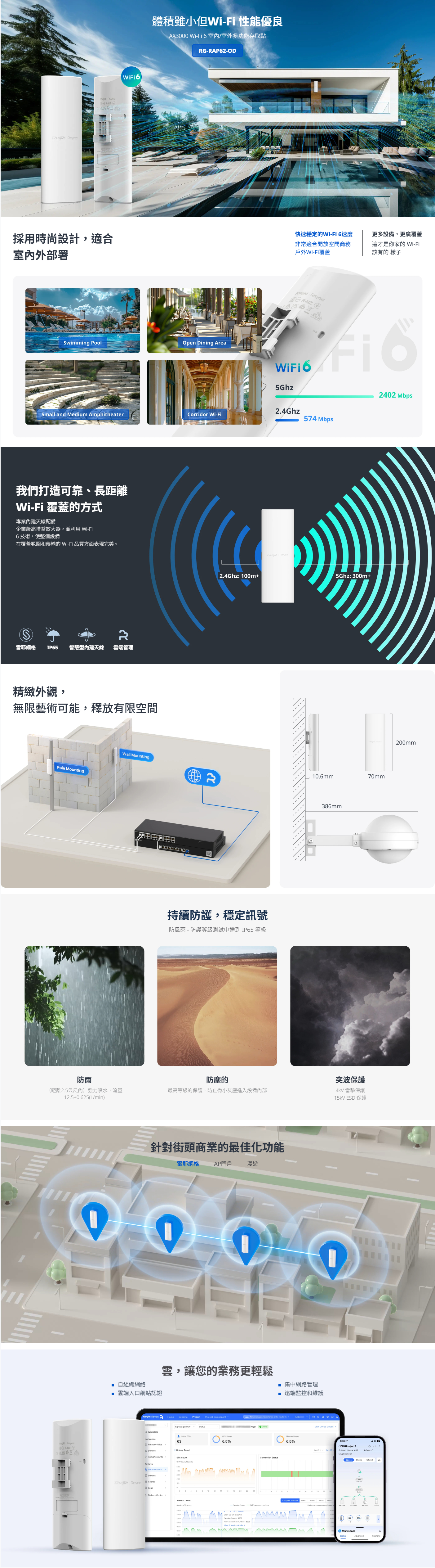 | 產品描述 | AX3000 Dual-Band Gigabit Wireless Access Point IP65 waterproof, 2401 Mbps at 5 GHz + 573 Mbps at 2.4 GHz, 1 x 10/100/1000BASE-T port, Built in omnidirectional antennas, support 802.11a/b/g/n/ac/ax, 2x2 MIMO;IEEE 802.3af/at standard PoE power supply24 V passive PoE power supply (PoE and local power adapters sold separately)Maximum power consumption < 16 W“ |