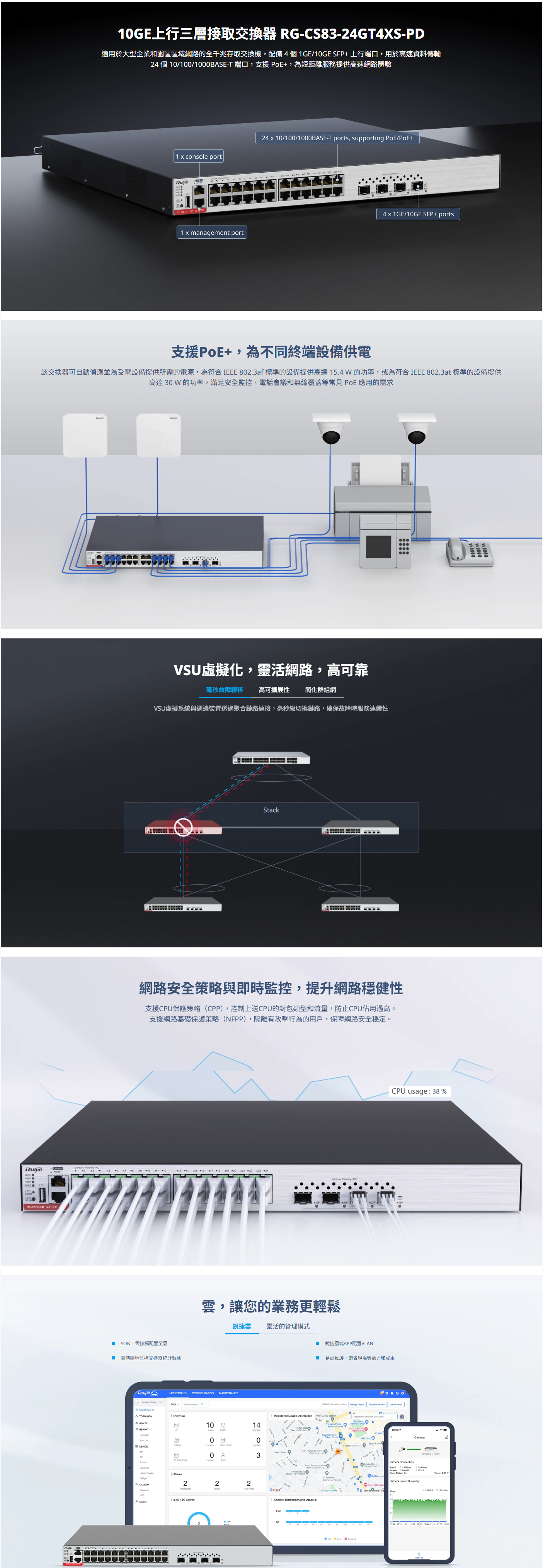 | 產品描述 | 24-Port 10/100/1000BASE-T,and 4 1G/10G SFP+ Ports, support Poe/PoE+, max 740w for PoE, 1 built-in fixed fan, 2 modular power supply slots (at least one RG-PA600I-P-F/RG-PA1000I-P-F power module needed) |