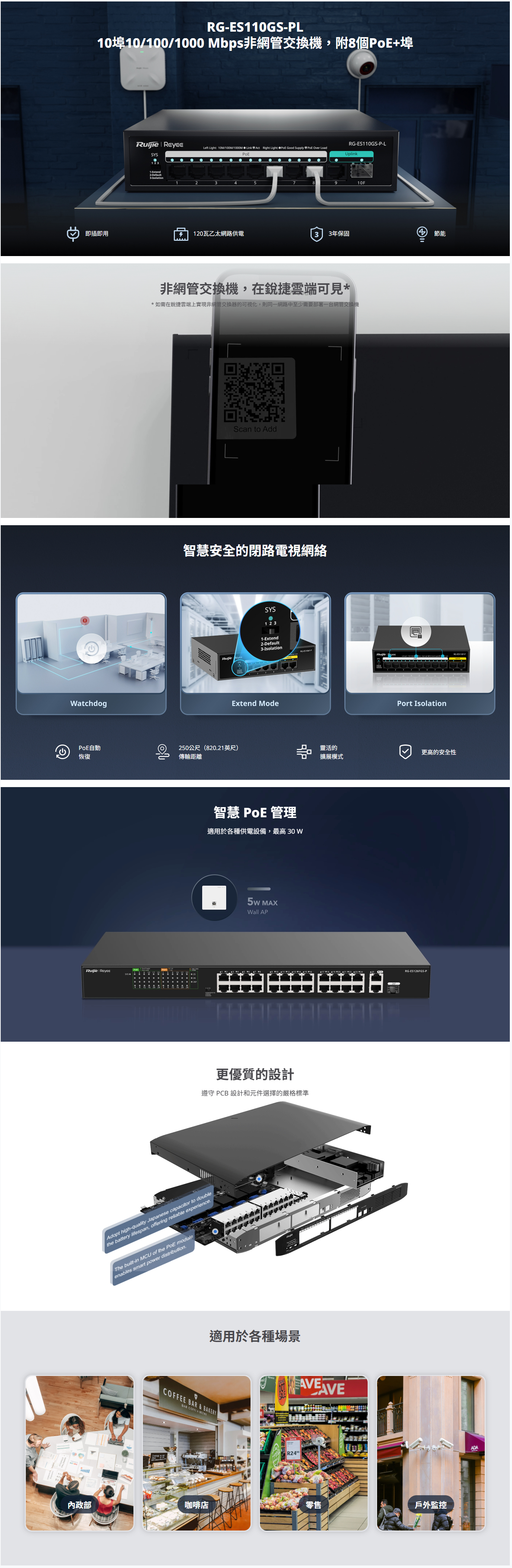 | 產品描述 | 8-Port 1000Mbps + 1 Uplink Port 1000Mbps + 1 Uplink SFP Port,8 ports for PoE/PoE+, Max PoE power budget is 120W, Steel Case |
