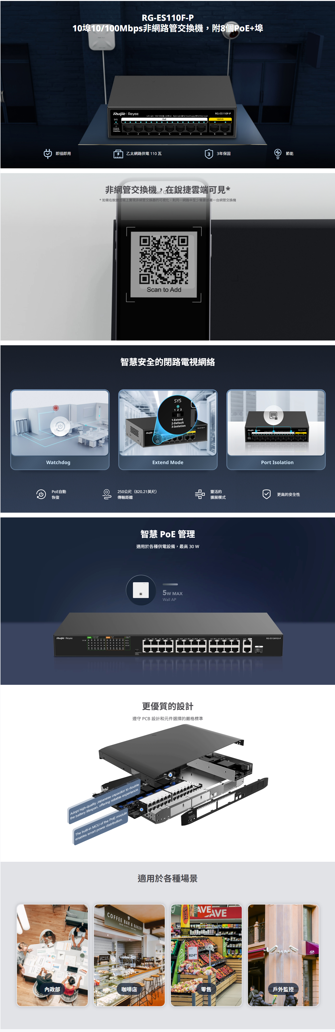 | 產品描述 | 10-Port 100Mbps, 8 of the ports support PoE/PoE+ power supply. Max PoE power budget is 110W, Steel Case |