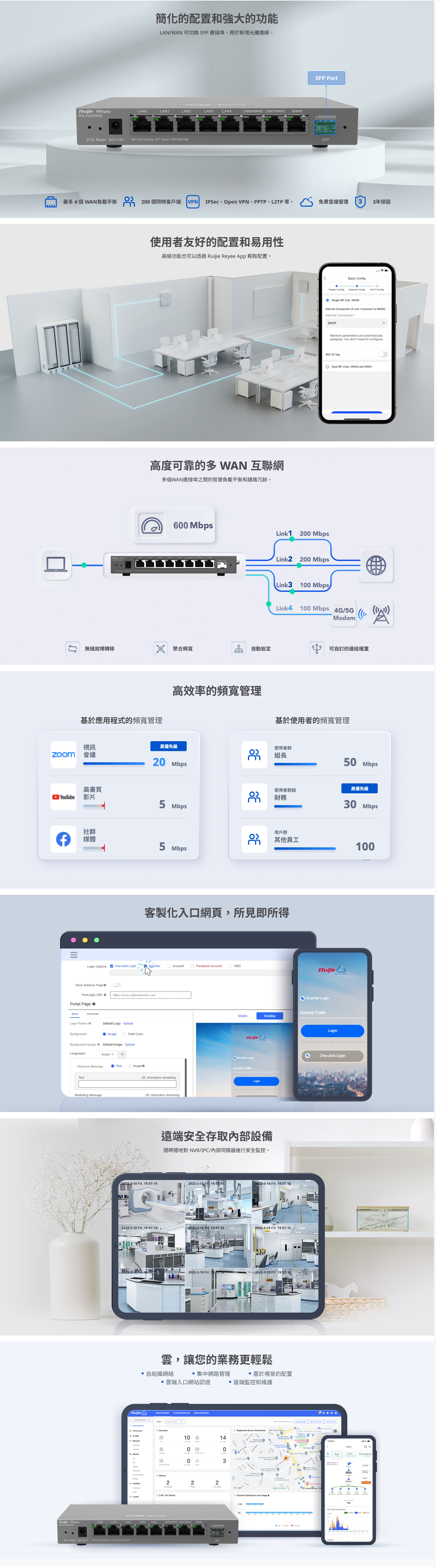 | 產品描述 | Desktop 9-port cloud management router , including 8 gigabit electrical ports and 1 gigabit SFP port , supports 1 WAN port , 5 LAN ports , and 3 LAN /WAN ports ; a maximum of 200 concurrent users are recommended, With a maximum throughput of 600Mbps; support cloud remote management. |