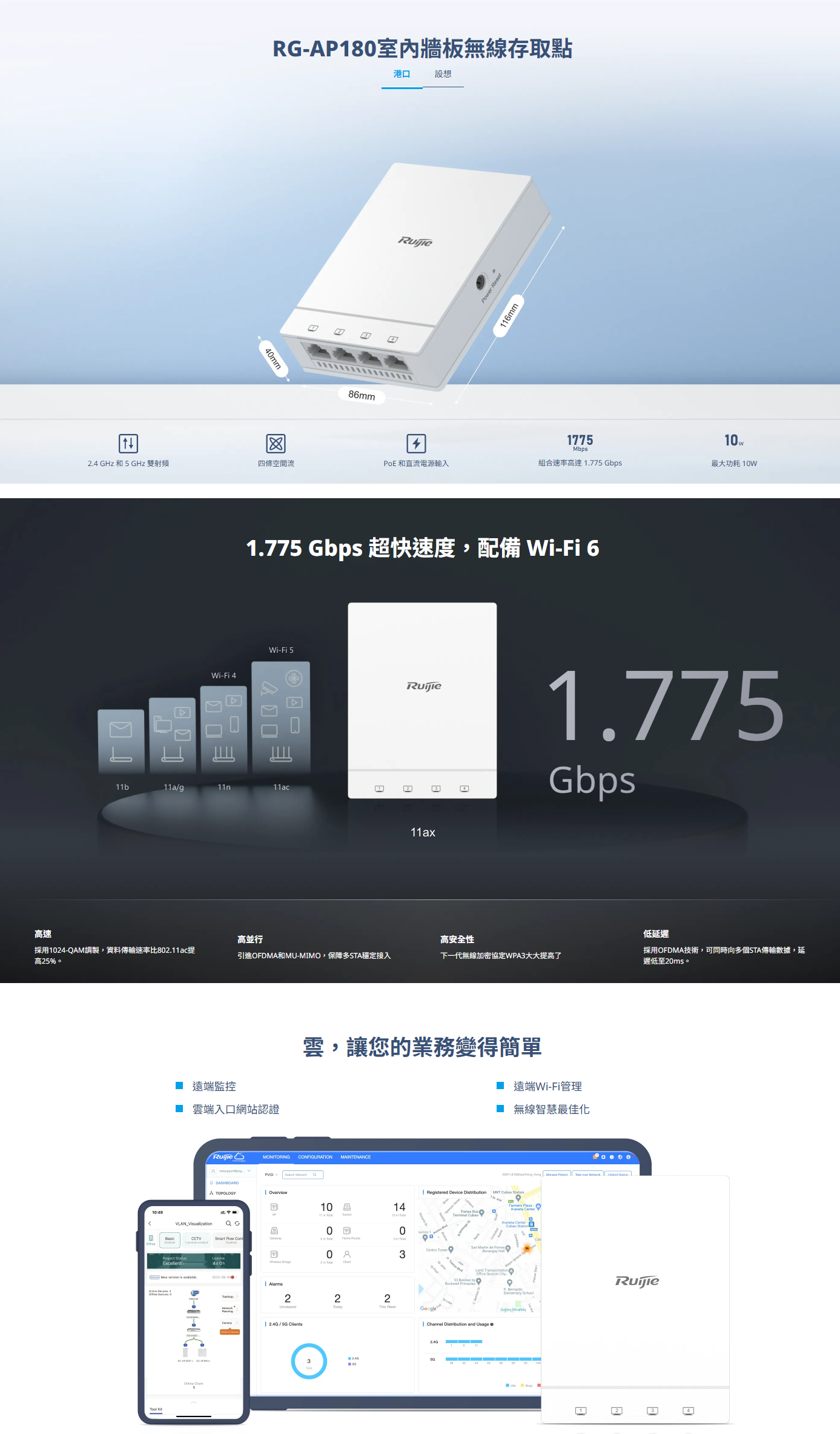| 產品描述 | Wall Plate Wi-Fi 6 (802.11ax) Access Point, standard size of 86-type faceplate, built-in antenna, dual-radio dual-band, support 574.5Mbps @2.4G and 1.2Gbps @5G, up to 4 spatial streams and 1774.5Mbps access rate per AP, support concurrent 802.11a/b/g/n/ac and 802.11ax, FAT/FIT mode, PoE+ and local power supply, bundled with Ruijie Cloud Service lifetime license (Power adaptors for PoE+, local power supply, US/EU mount kit are sold separately) |