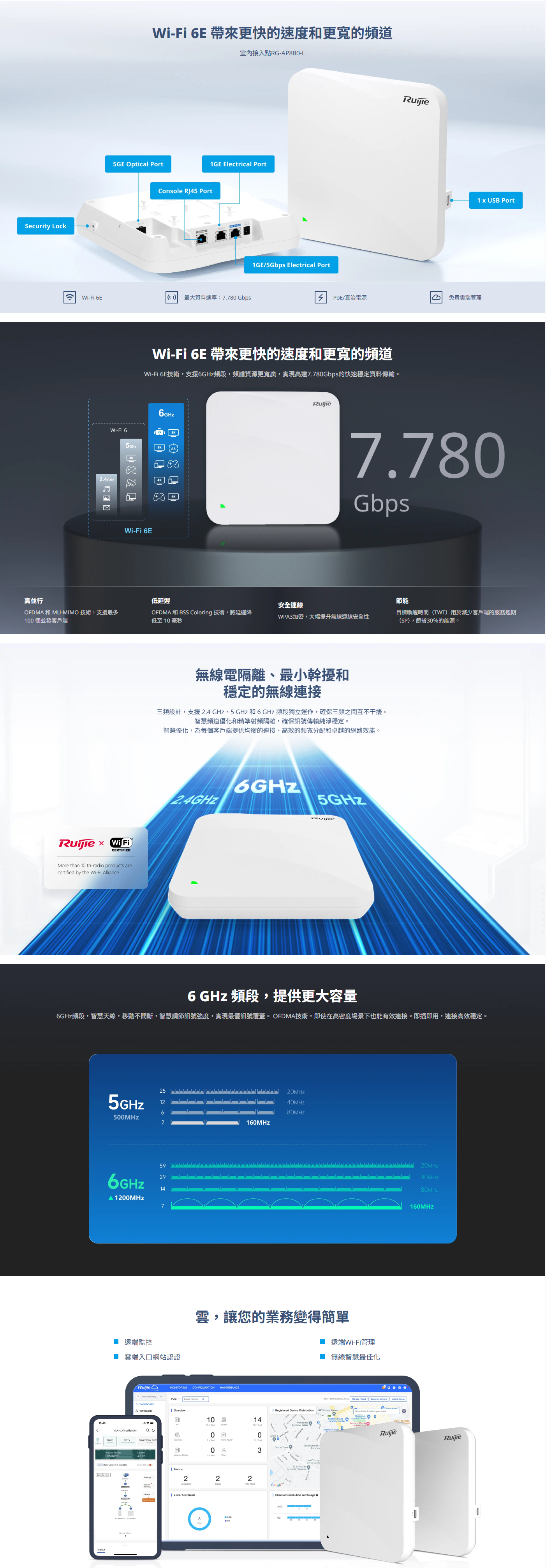| 產品描述 | Wi-Fi 6e indoor wireless access point, dual-radio, dual-band, up to 8 spatial streams and maximum of 7.77Gbps wireless throughput, 1 1/2.5/5G Combo uplink port, support PoE/PoE+/PoE++ and local power supply; 1 10/100/1000M Base-T downlink port supporting PSE out; Bundled with Ruijie Cloud Service lifetime license (PoE/PoE+/PoE++ Adapters are sold separately, which could be purchased from Ruijie; While DC adapters should be purchased from third-party vendors separately if needed) |
