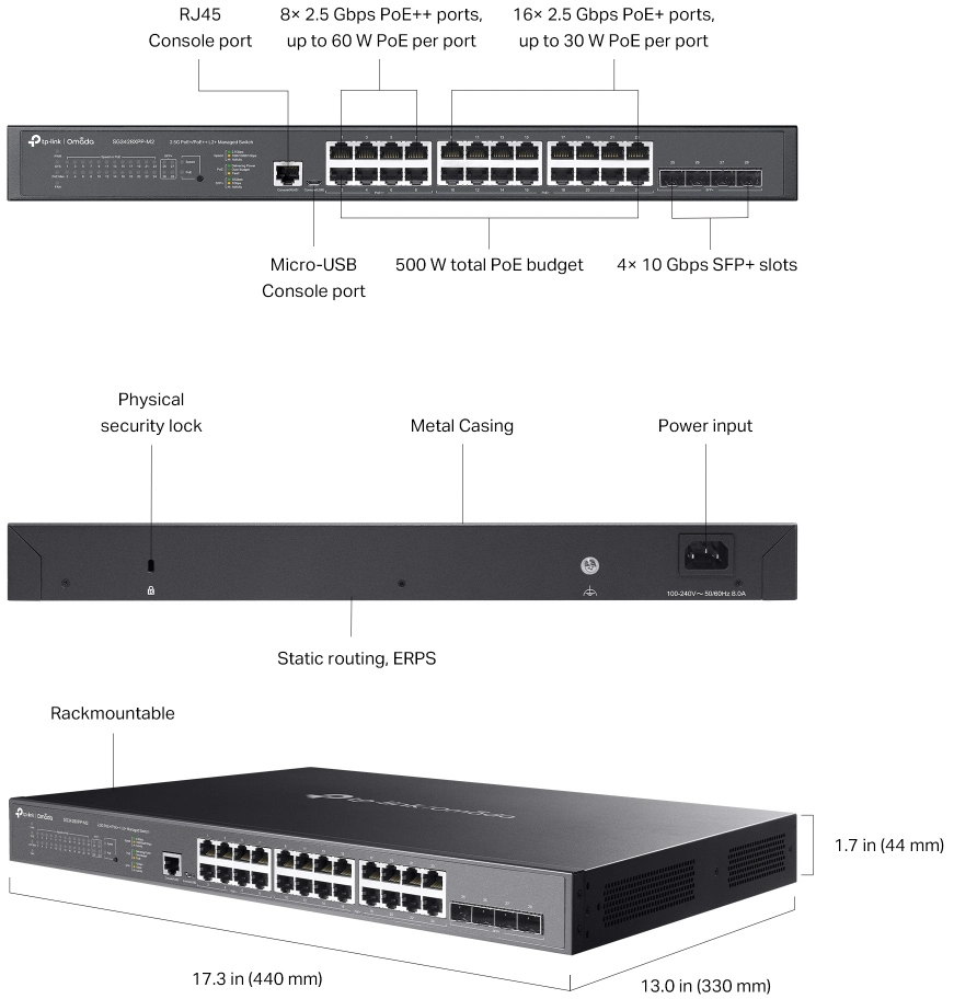 | Omada 24-Port 2.5GBASE-T and 4-Port 10GE SFP+ L2+ Managed Switch with 16-Port PoE+ & 8-Port PoE++ (500W) , 1U 19-inch Rack-mountable Steel Case | |
