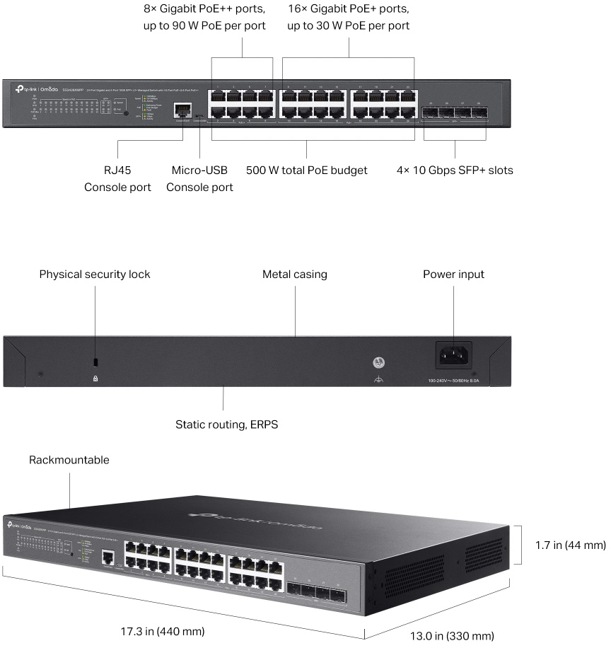 | Omada 24-Port Gigabit and 4-Port 10GE SFP+ L2+ Managed Switch with 16-Port PoE+ & 8-Port PoE++ (500W), 19-inch Rack-mountable Steel Case | |