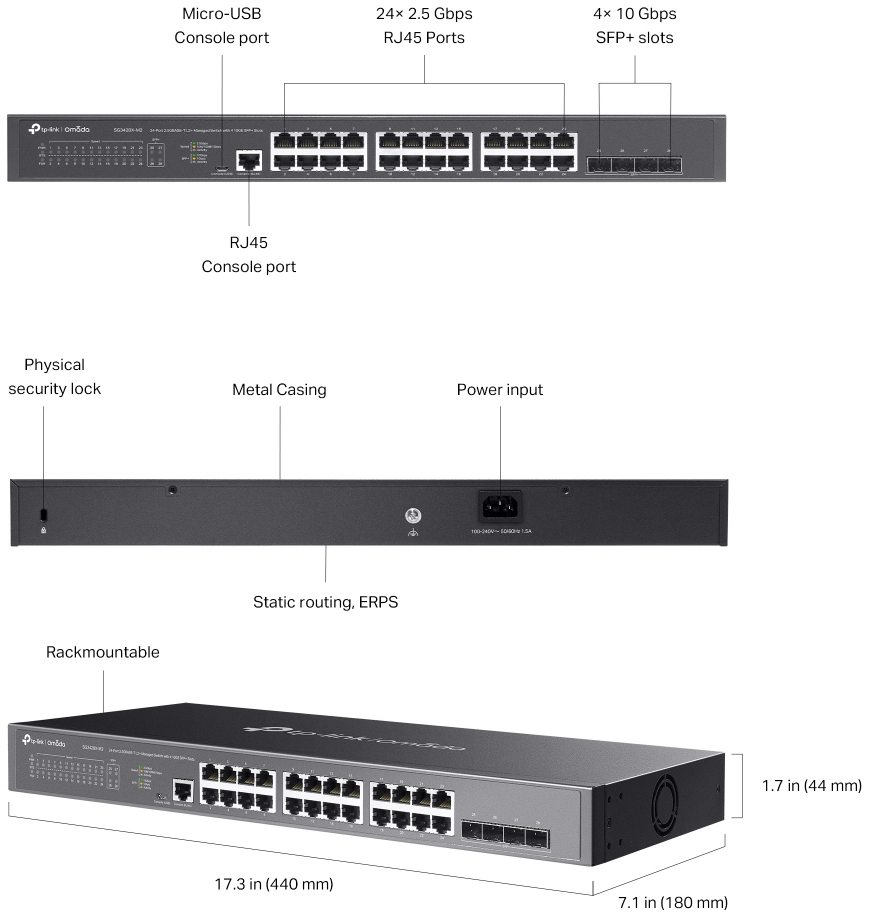 | Omada 24-Port 2.5GBASE-T L2+ Managed Switch with 4 10GE SFP+ Slots, 1U 19-inch Rack-mountable Steel Case | |