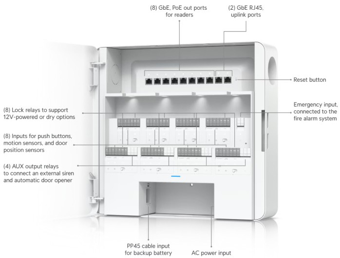Enterprise-grade access hub with entry and exit control up to eight doors and battery backup support. |