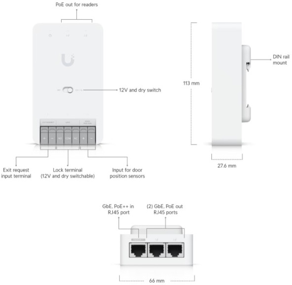 | PoE Interfaces | (1) PoE++ input, 50V DC, 1A (2) PoE outputs, 50V DC, 30W per port |