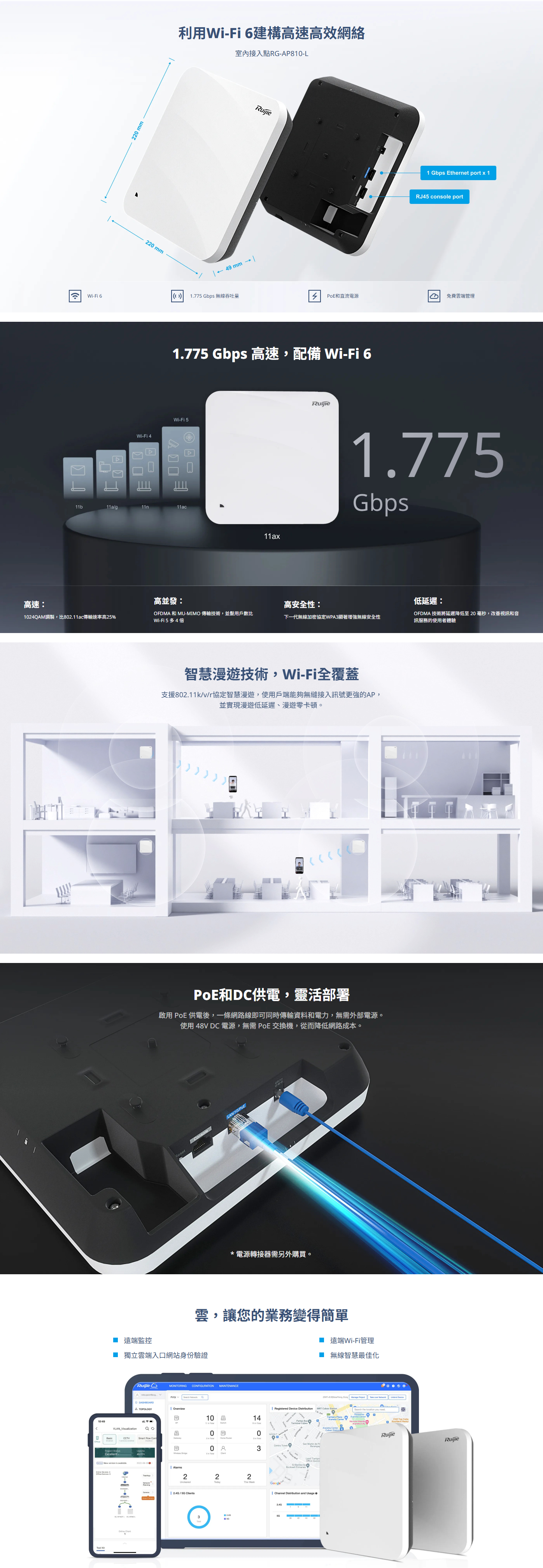 | 產品描述 | Wi-Fi 6(802.11ax) indoor wireless access point, dual-radio, dual-band, up to 4 spatial streams and maximum of 1.775Gbps wireless throughput, 1 10/100/1000M BASE-T uplink port, support PoE and local power supply; Bundled with Ruijie Cloud Service lifetime license (PoE Adapters are sold separately, which could be purchased from Ruijie; While DC adapters should be purchased from third-party vendors separately if needed) |
